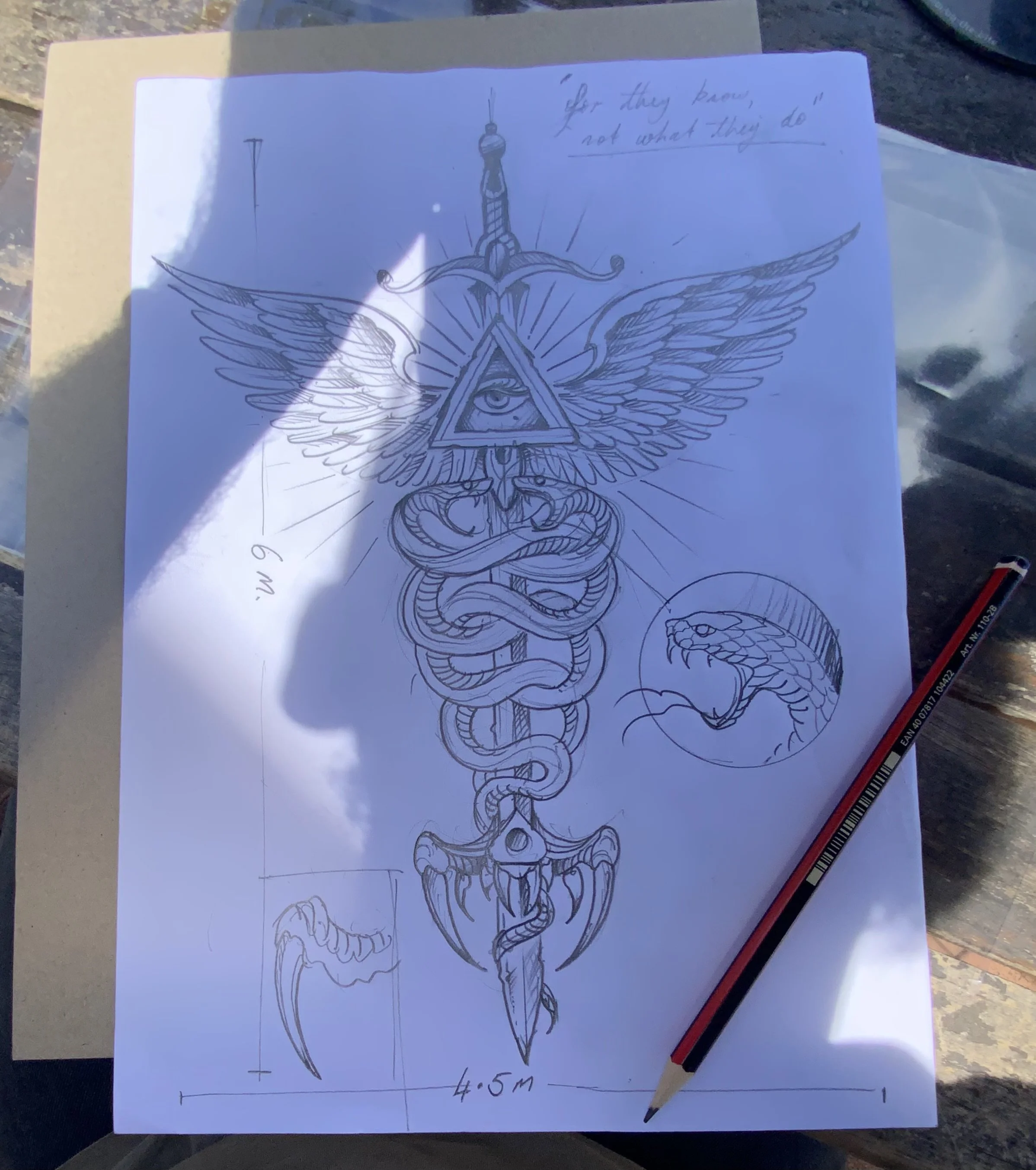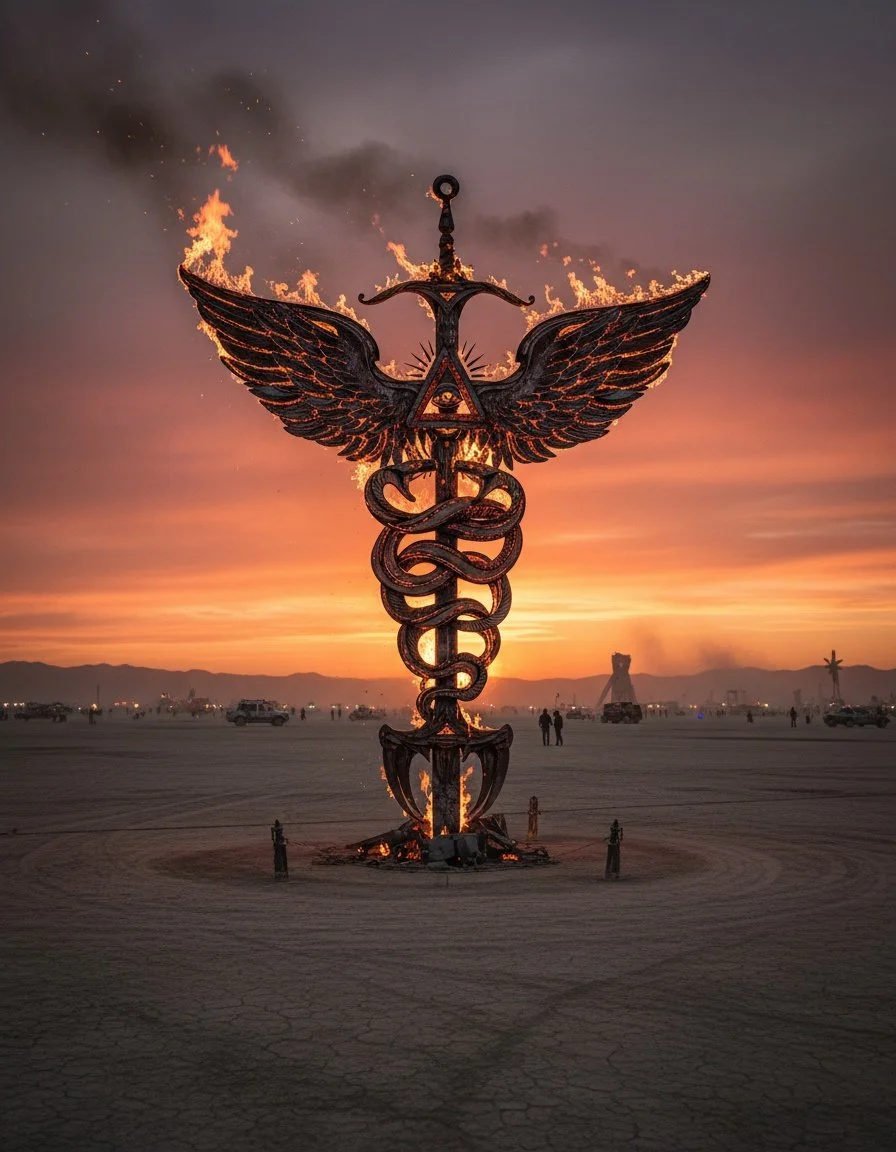 For They Know Not What They Do is a proposed art project for Burning Man 2026. The work takes the form of a 6-meter (19.6’) steel caduceus rising from the Playa — a sword entwined with twin serpents, crowned by angel wings and an all-seeing eye. Constructed from stainless steel, brass, and mild steel, the sculpture bends and reflects desert light, creating a sense of watchfulness and tension.